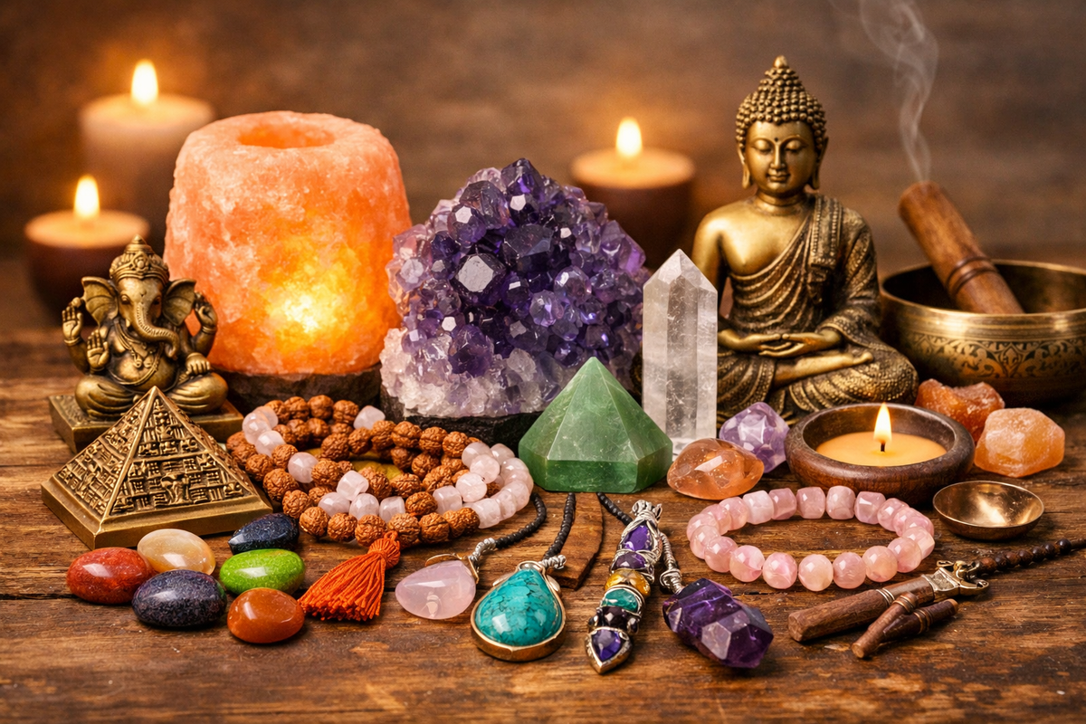 We offer a wide range of spiritual and healing products including Vastu items, crystals, malas, crystal jewellery, pendants, Himalayan salt products, and meditation tools designed to support positive energy and well-being.